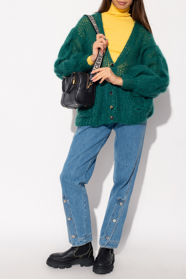Green cardigan from Loewe. Fastened with buttons, this V-neck design features a logo embroidery at the back and long puff sleeves.
