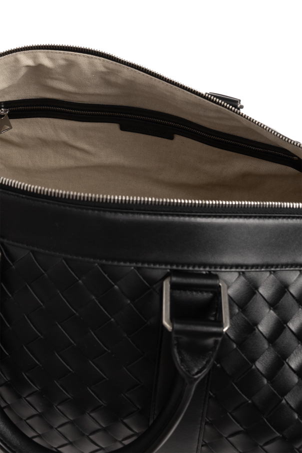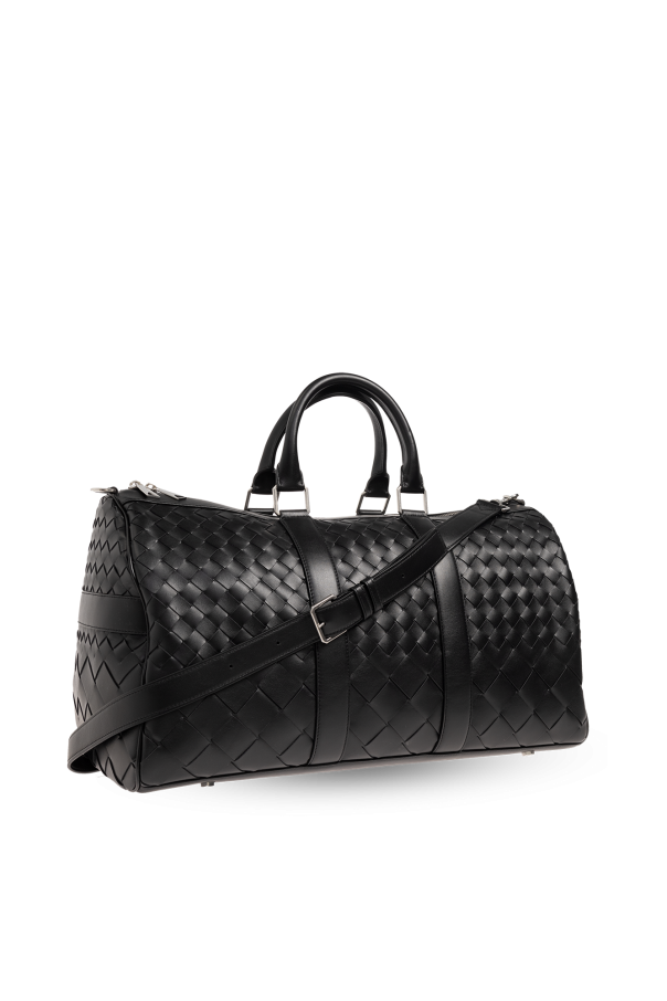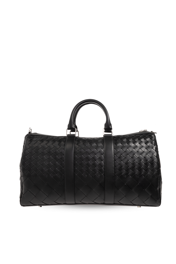 Black duffel bag from Bottega Veneta. Made of calf leather accentuated with the brand's signature Intrecciato weave, this design fastens via a two-way zip and features a detachable and adjustable shoulder strap, two half-round handles, one zip pocket on the side, silver-tone metal hardware and one internal compartment with one zip pocket and two slip pockets.