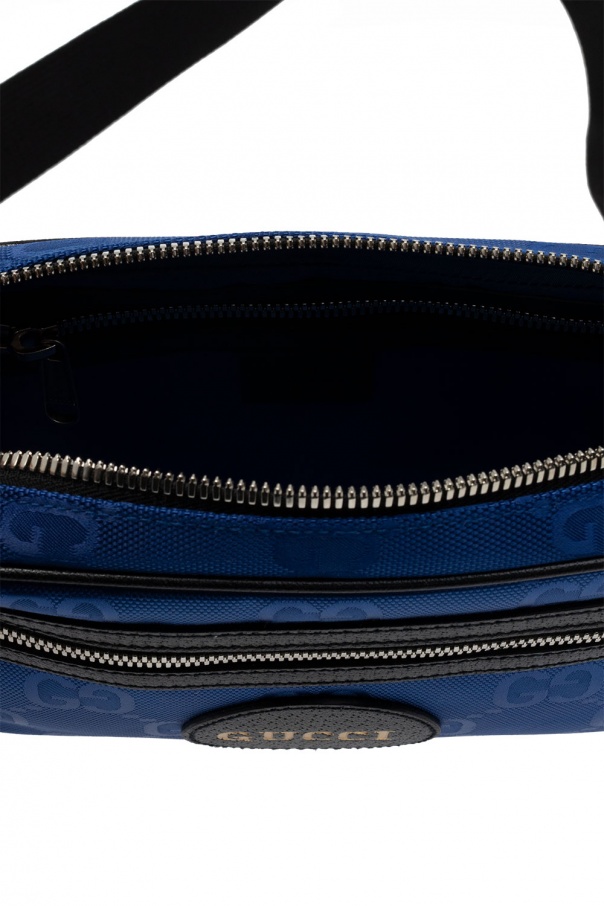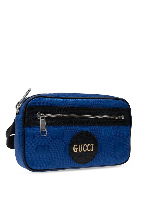 Blue and black belt bag from Gucci. Trimmed with black leather, this item features a zip fastening, embroidered logo pattern, round patch, adjustable belt and main internal compartment with one slip pocket and one zip pocket.