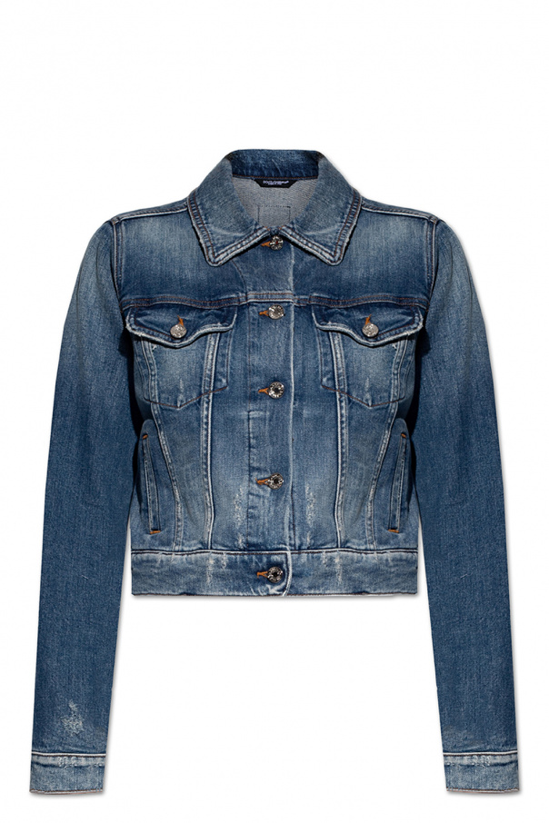 Navy denim jacket from Dolce & Gabbana. Made of cotton, this garment features buttons fastenings, logo appliqué, two slip pockets, two buttoned flap pockets and long sleeves.
