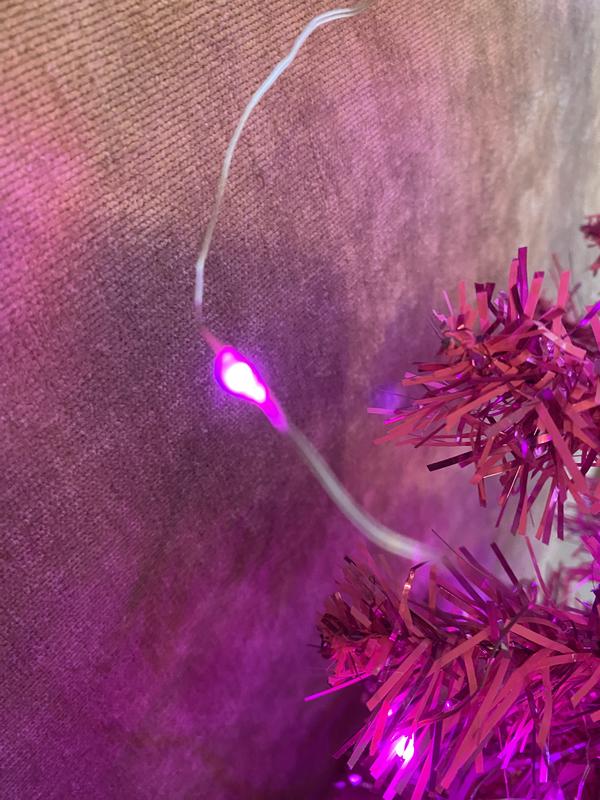 Пропоную невелику ялинку з дощика рожевого кольору на підставці. Висота 60 см. Разом з ялинкою світлодіодна гірлянда на батарейках . Гірлянда горить рожевими вогниками постійно, не блимає.
