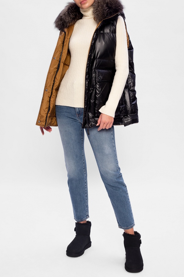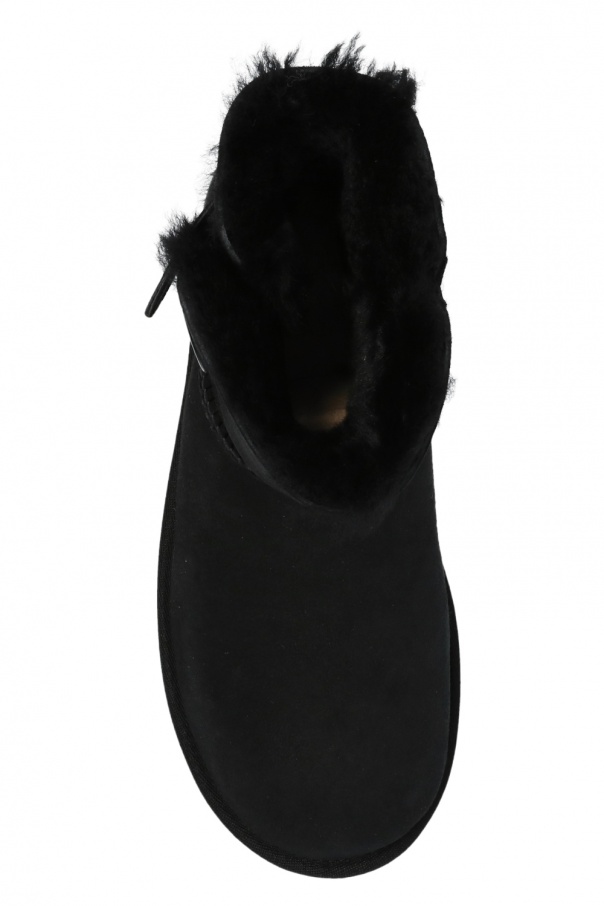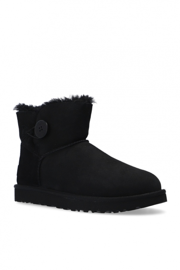 Black 'Mini Bailey Button II' snow boots from UGG. Crafted from suede, this pair is set on a lightweight and flexible black sole in EVA foam and features sheepskin lining, logoed button closing on the side, distinctive stitching details as well as logo patch on the heel for the brand recognition.