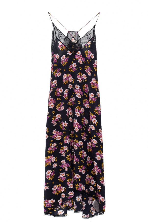 Black dress with straps from Zadig & Voltaire. Crafted from silk, this asymmetrical design is enriched with a colorful floral print and lace trims.