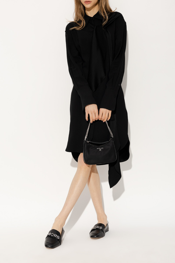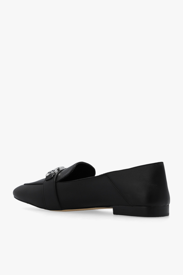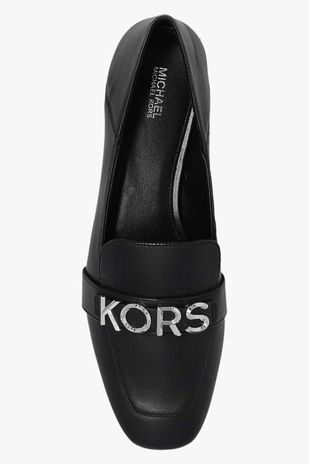 Black ‘Madelyn’ loafers from Michael Michael Kors. Made of leather, this model sits on a cream and black rubber sole and showcases silver-tone logo hardware on the front.