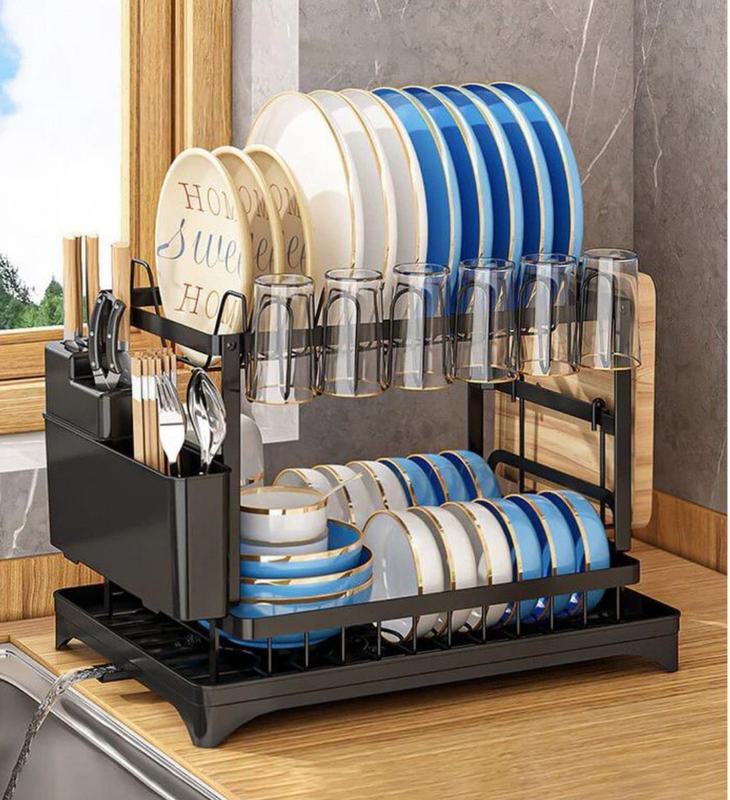 Решітка для сушіння посуду для кухонної стійки: щоб заощадити простір вашої маленької кухонної стійки, ця сушарка для посуду має двошарову конструкцію великої місткості та дозволяє зберігати майже весь посуд. Передбачено дренажну панель для збору будь-якої доступної води.
