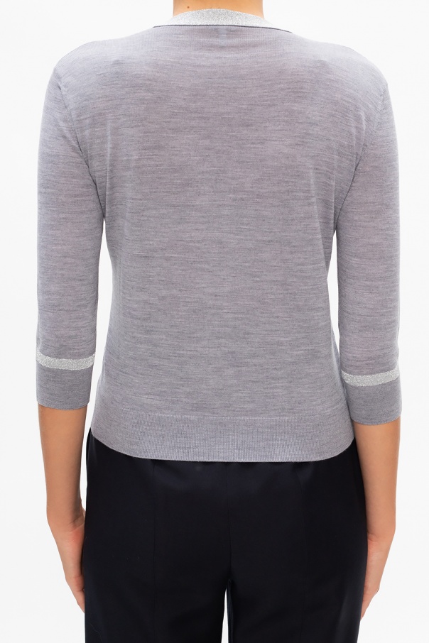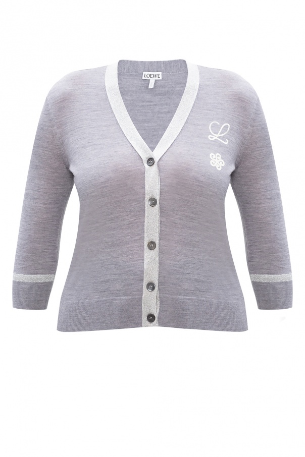 Grey cardigan from Loewe. Embroidered with monogram detail on the chest, this wool-crafted style features button fastening, three-quarter length sleeves and gold-tone lurex yarn trims.