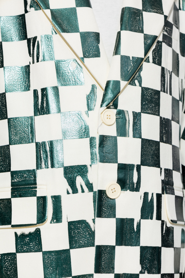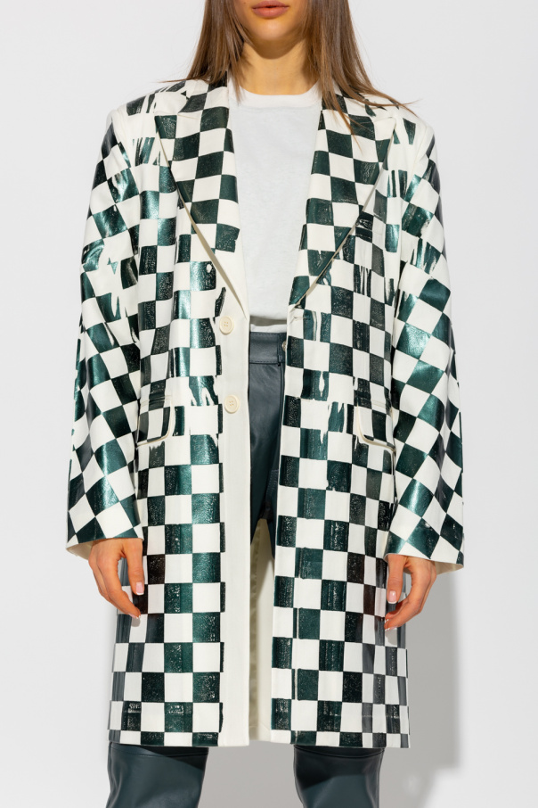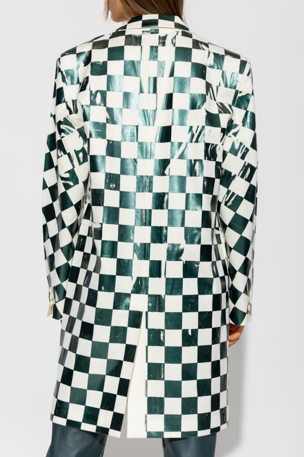 Cream and green coat from MM6 Maison Margiela. Fastened with buttons, this design features a check pattern, two flap pockets, one slip pocket, padded shoulders, peak lapels and a single rear vent.