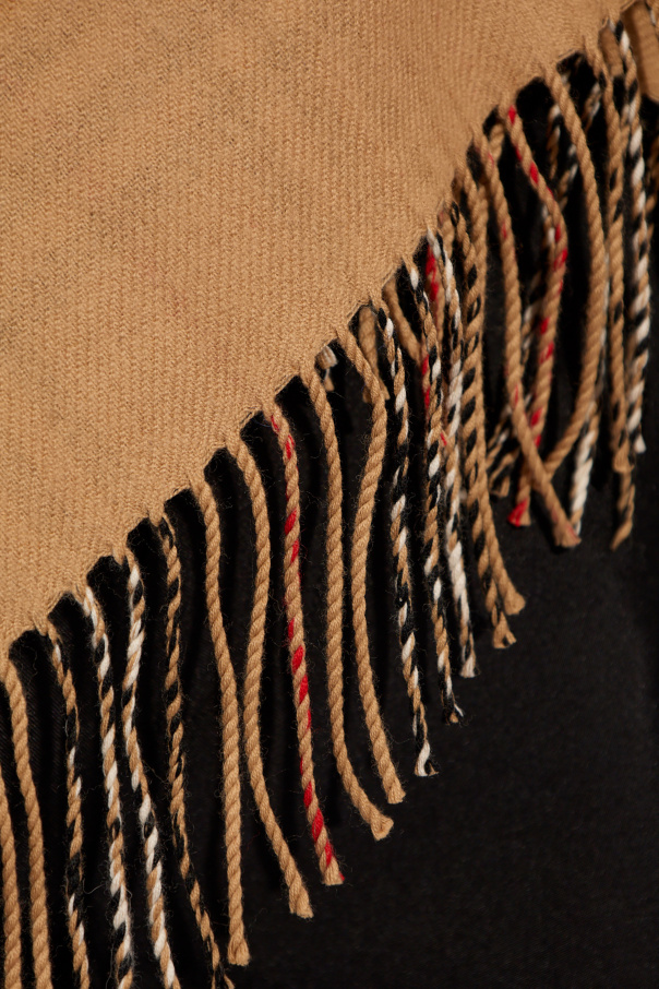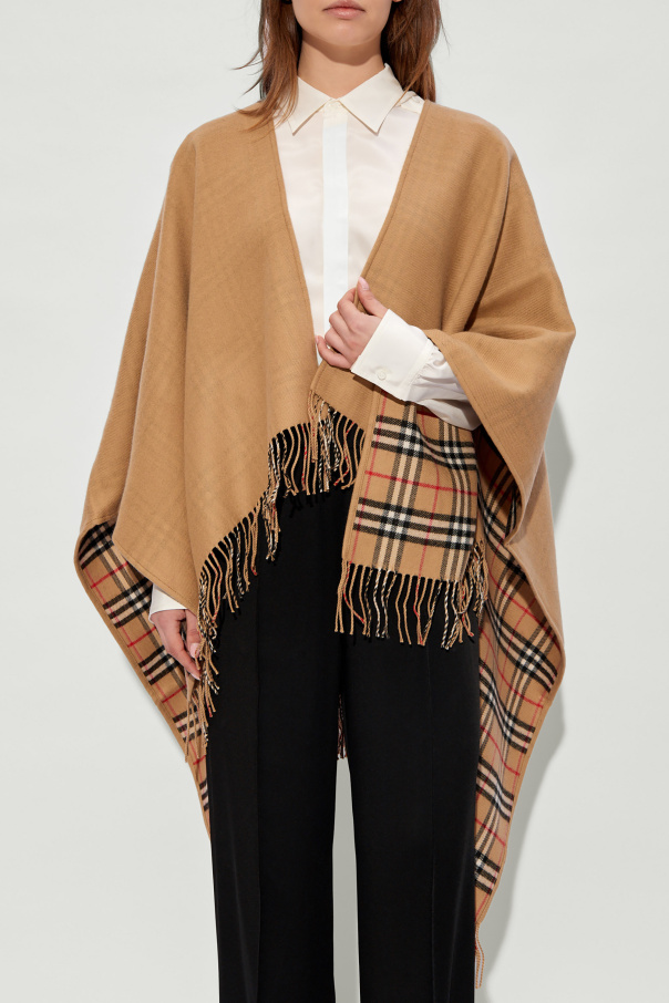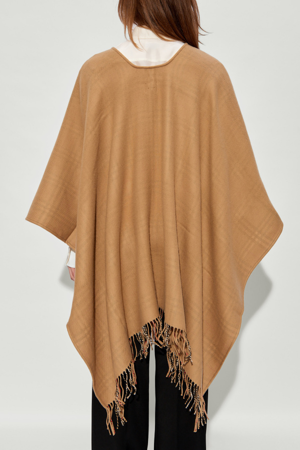 Beige poncho from Burberry. Crafted from wool, this design features fringes and a multicolored checked lining.