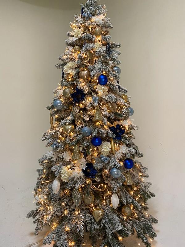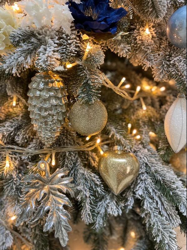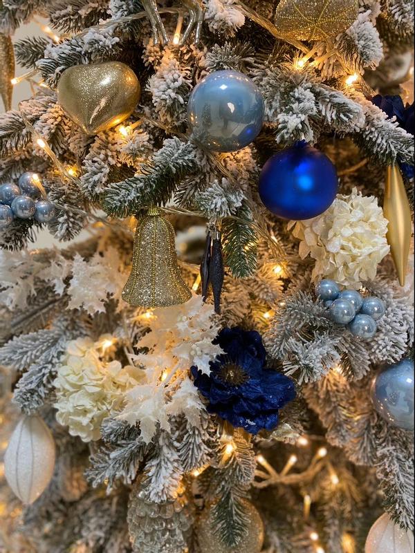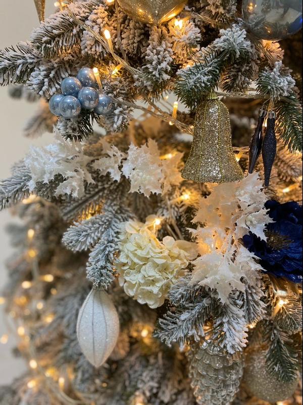 В комплект входить: Засніжена гортензія біла велика 2 шт, середня 2 шт, Гілки лавра білі в блискітках 2 шт, квітка тканинна синя 3 шт, падубок засніжений пучок 9 шт, куля синя 8см скло 3 шт, куля ніжно-блакитна перла пучок кульок блакитний перламутр 7 шт. шт, лист великий платина 2 шт, олень платина 1 шт, дзвіночок золото гліттер 3 шт, підвіс еліпс білий гліттер 2 шт, бурульки міні темно-синього кольору 12 шт.