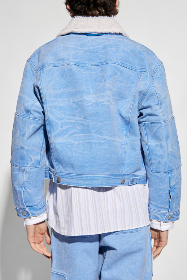 Blue denim jacket from Acne Studios. Made from washed cotton with distressed details, this style fastens via buttons and features a logo patch on the front, two slip pockets, two flapped pockets with buttons as well as a detachable collar in white faux fur and long sleeves with cuffs.