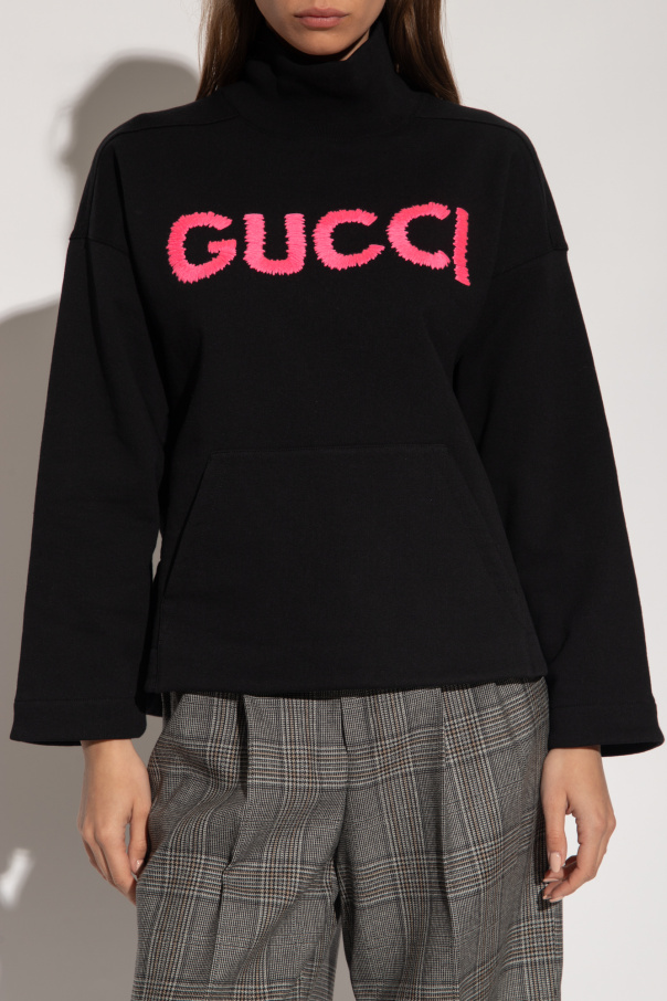 Black sweatshirt with a standing collar from Gucci. Made of cotton with a relaxed fit, this style showcases an embroidered pink logo, a kangaroo pocket, side slits and long sleeves.
