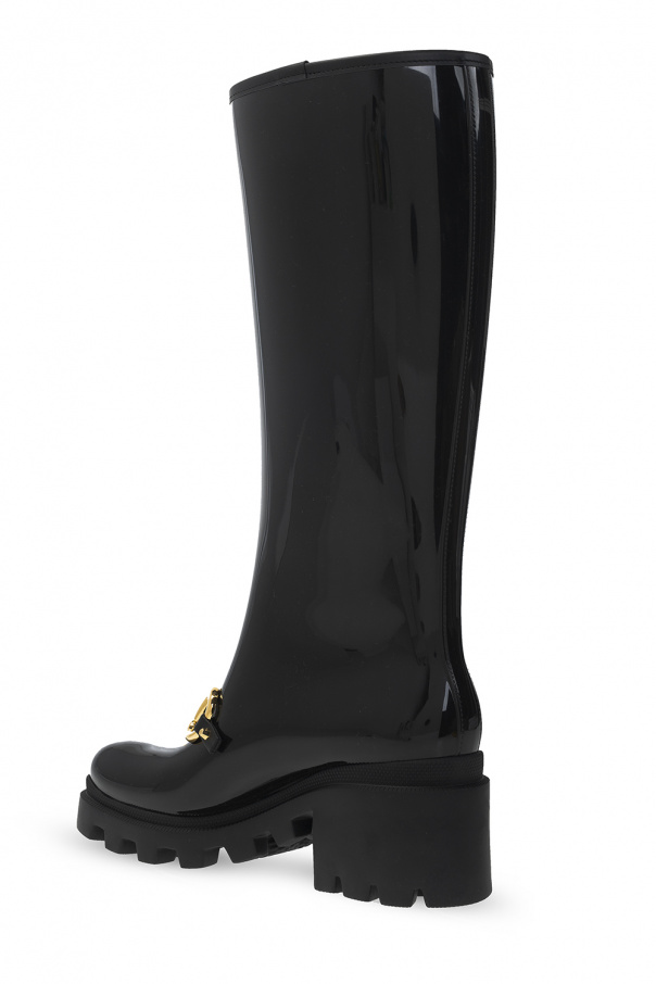 Black rain boots from Gucci. Sitting on a black rubber sole, this model showcases the brand's iconic gold-tone horsebit hardware on the front.