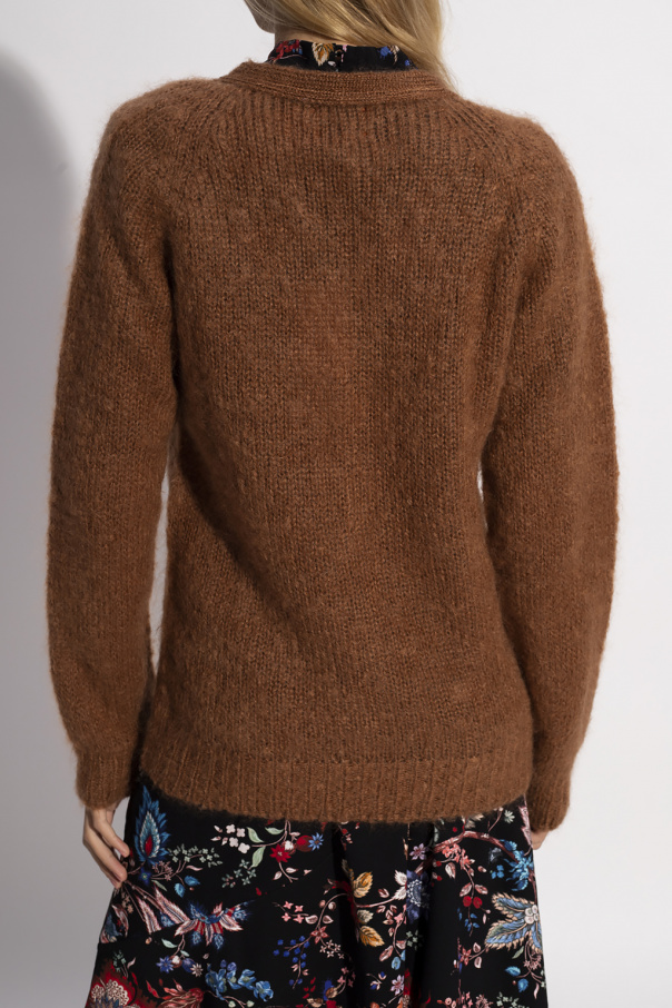 Brown cardigan from Erdem. Knitted from a mohair and wool blend, this garment fastens with decorative buttons.