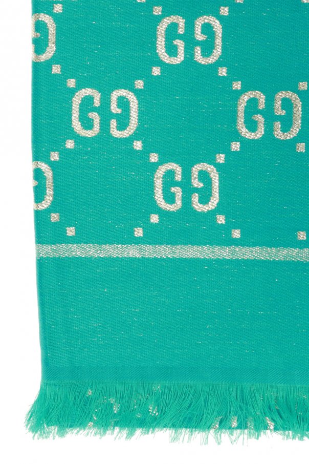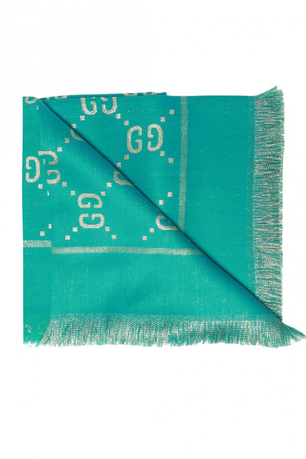 Blue scarf from Gucci Kids. Trimmed with wool and silk. Decorated with a logo pattern embroidered with a gold-tone lurex thread. Fringe ends.