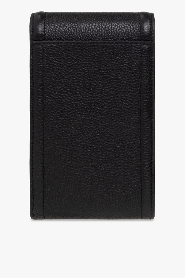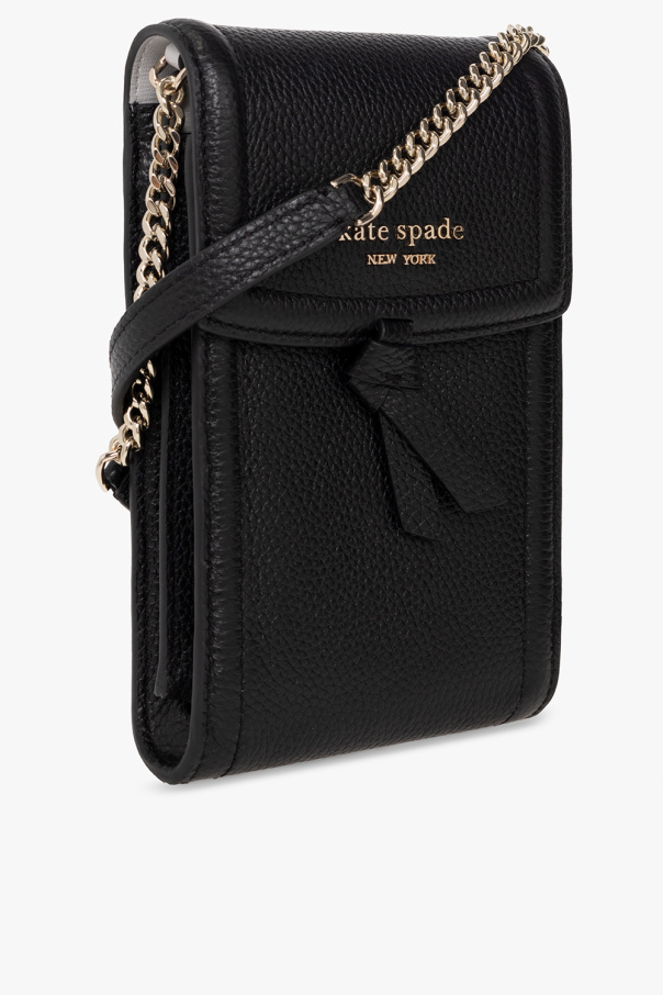Black ‘Knott’ phone pouch from Kate Spade. Crafted from grain leather, this model fastens with a snap and is decorated with a metal logo and decorative fringes. It is complete with a back pocket, adjustable shoulder strap with a chain insert, silver-tone metal hardware, slip pocket and one internal compartment with three card slots.