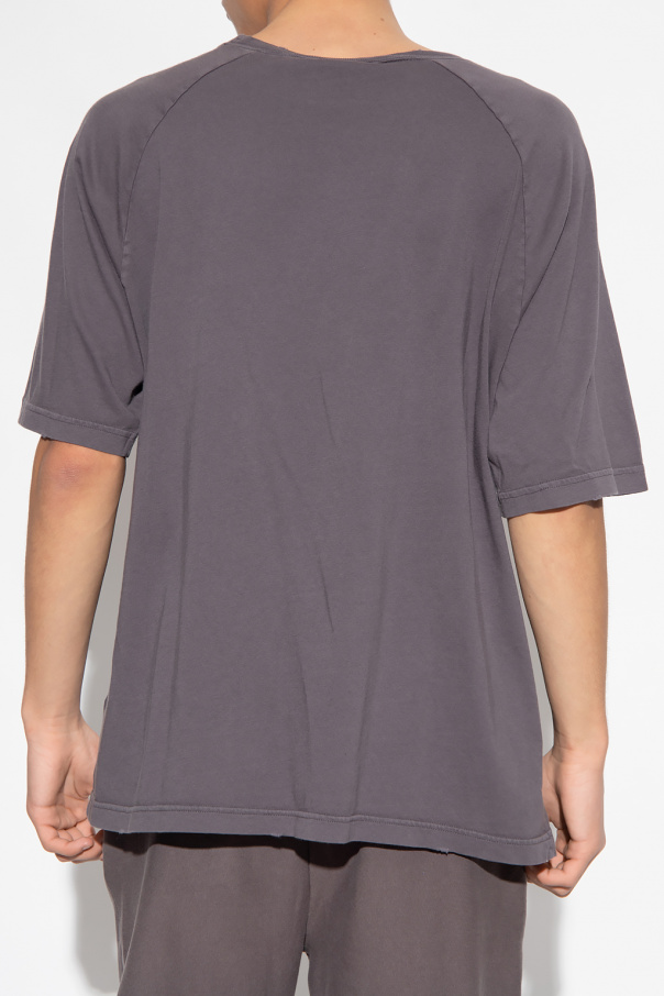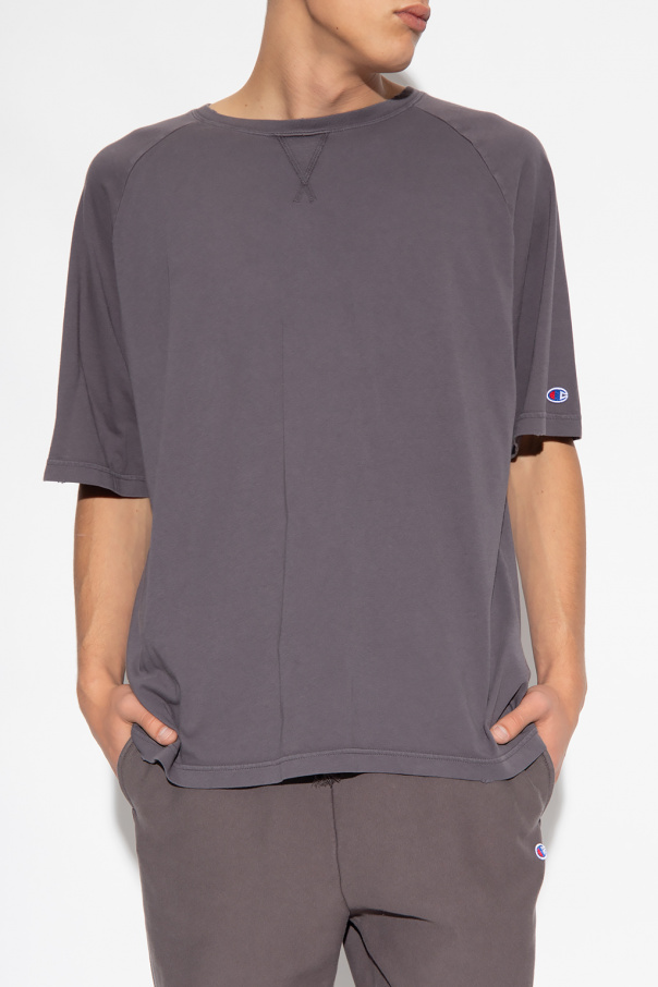 Grey T-shirt from Champion. Crafted from cotton, this short sleeve design features a ribbed crew neck, vintage effect and logo patch in white, blue and red.