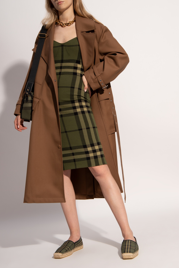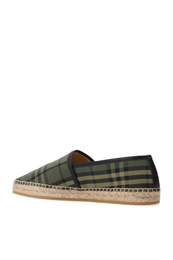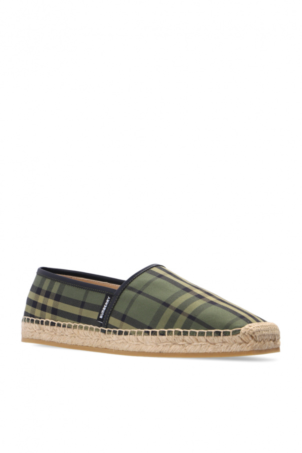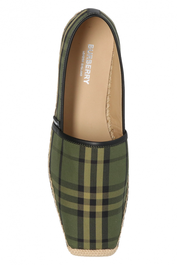 Green and black 'Alport' espadrilles from Burberry. Crafted from cotton and finished with black sheepskin trims, this model sits on a beige rubber sole and showcases the brand's signature check pattern and a black patch with a white logo in the side.
