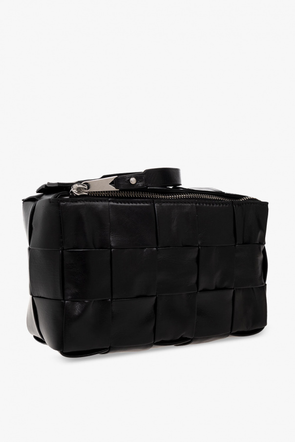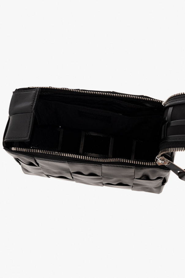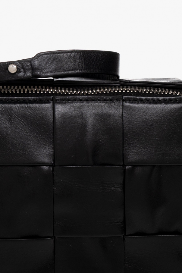 Black ‘Cassette’ wash bag from Bottega Veneta. Crafted from calf leather with the brand's signature ‘Intreccio’ weave, this design features a double zip fastening, a half-round handle, silver-tone metal hardware and one internal compartment with a slip pocket.