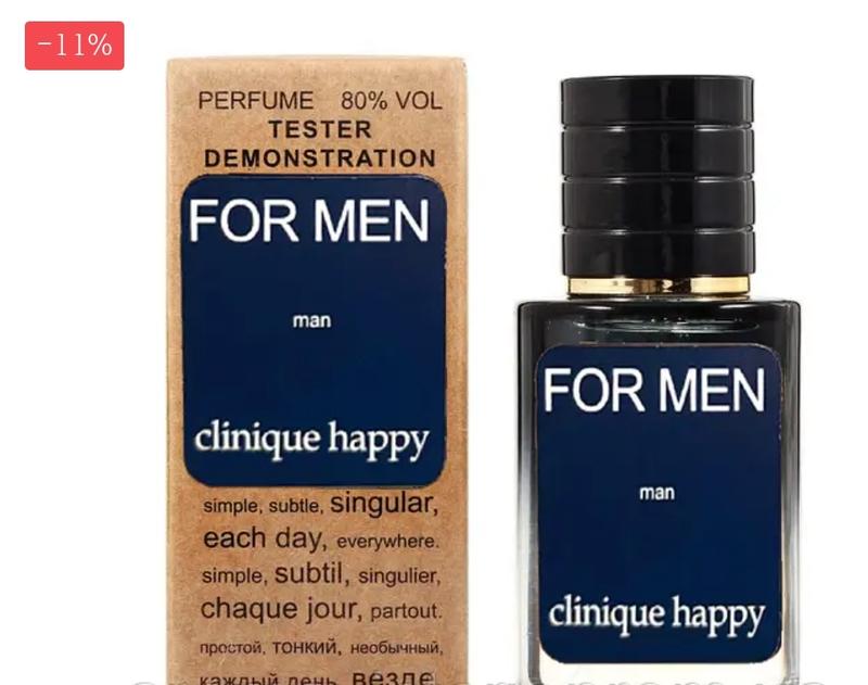 Happy For Men - аромат, который призван удивлять, заставит радоваться жизни, проявит хорошее настроение и оптимизм. Радужные надежды станут более реальными, а улыбка не будет сходить с лица каждый день. Clinique Happy - аромат для счастливых людей, так звучит релиз к этому парфюму, впервые появившийся в 1999 году. Именно этот первый выпуск предлагается на сайте ********* Вариант представляет собой тестер объемом 60 мл, люксового качества. Пирамида аромата полностью повторяет оригинал:Верх: Мандаринка, Лайм, Зелень, Лимон, Морские нюансы.
