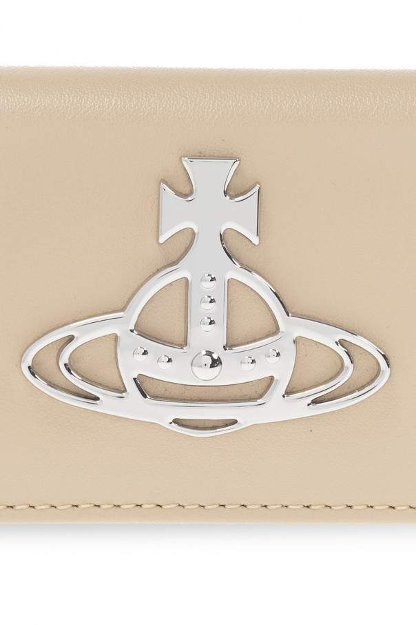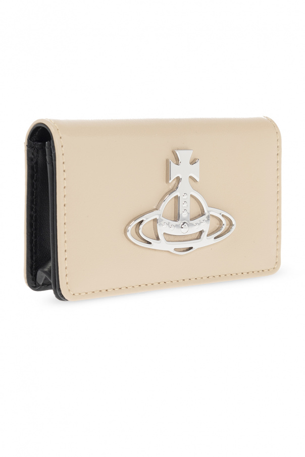 Beige and black ‘Betty’ card case from Vivienne Westwood. Made of calf leather, this item features a snap fastening, a logo application, a back slip pocket, silver-tone metal hardware, one internal compartment with a card slot.