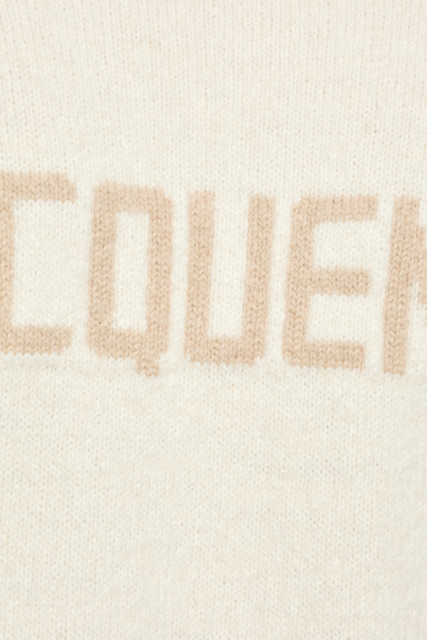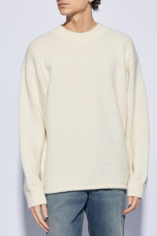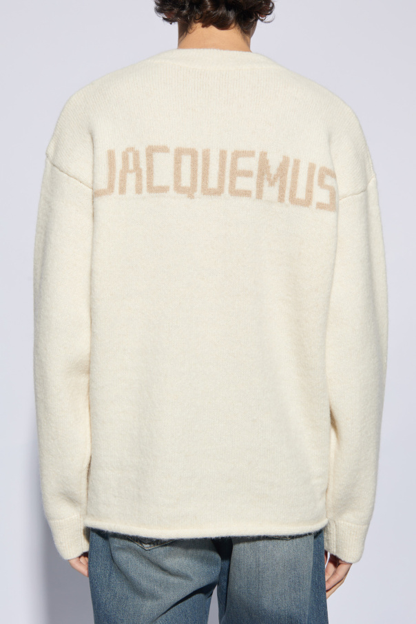 Cream sweater from Jacquemus. Made of a merino wool and alpaca blend, this style showcases a beige logo on the back, long sleeves with ribbed cuffs and a standing collar.