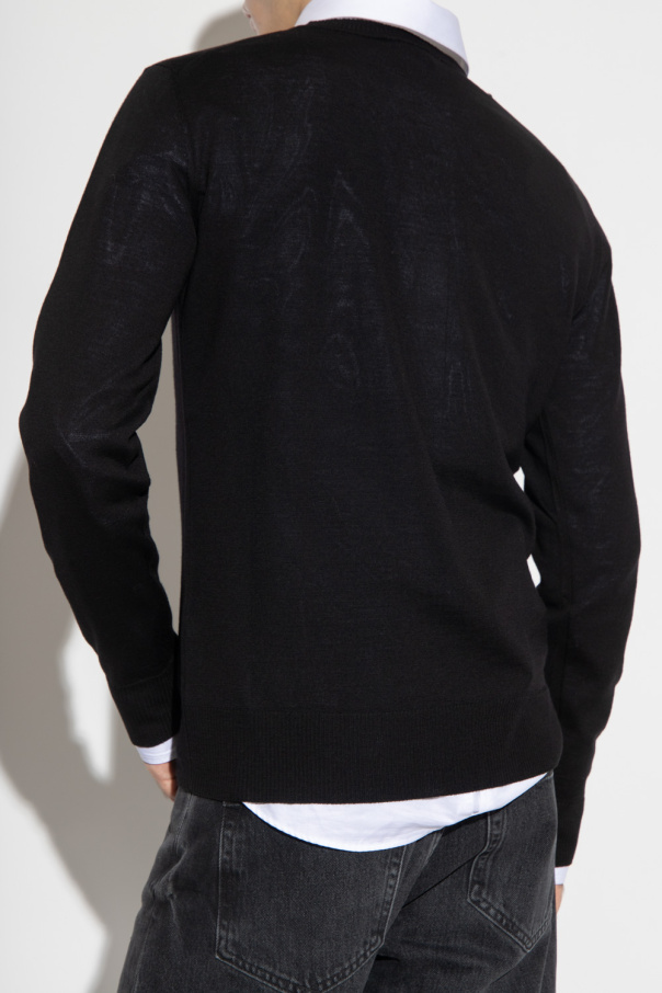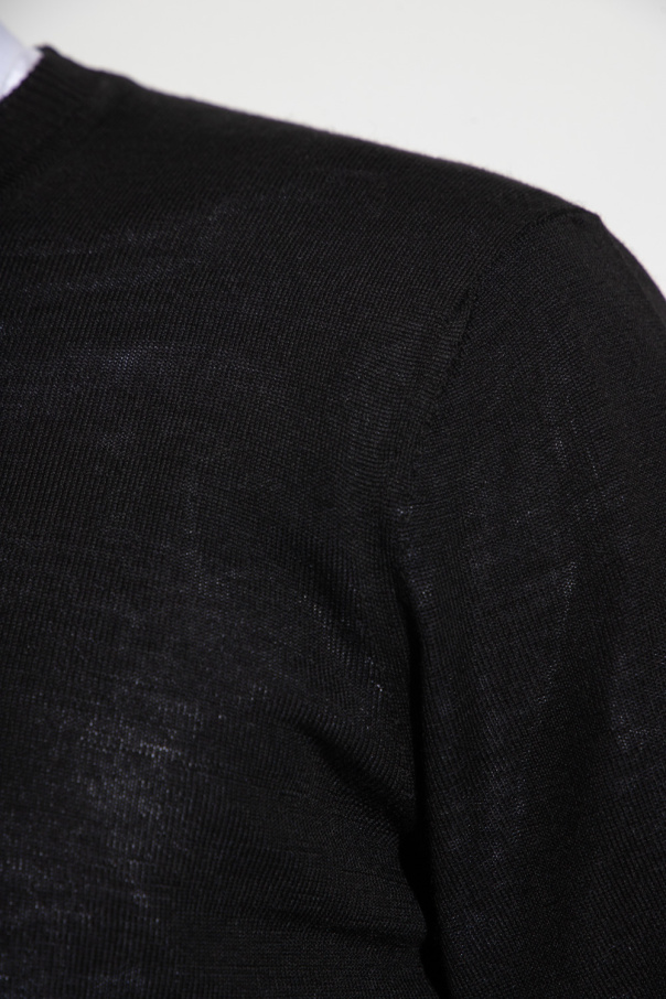 Black crewneck sweater from Emporio Armani. Crafted from virgin wool, this style features a regular fit and ribbed trims on the collar, bottom hem and long sleeves.