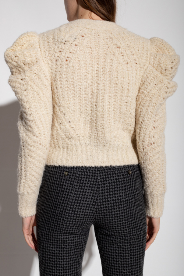 Cream ‘Odette’ cardigan from Ulla Johnson. Knitted with a cropped silhouette, this style features a V-neckline, button fastenings, blouson sleeves and ribbed trims.