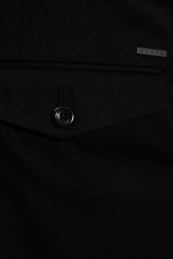 Black ‘Christopher’ pleat-front trousers from Norse Projects. Made of cotton, this pair features a button, hook and zip fastening, metal logo detail at the back, two front pockets and two buttoned back pockets.