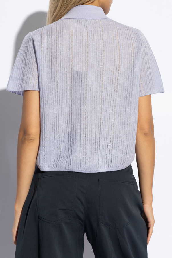 Discover the epitome of sophistication with the Top Polo by Theory. This exquisite piece is designed in a stunning shade of light purple, offering a perfect blend of elegance and comfort. The top boasts a classic polo cut with short sleeves and a slightly loose fit, ensuring maximum comfort. Crafted from a lightweight, ribbed material, it exudes both texture and refinement. Featuring three cream-colored buttons beneath the collar, this top allows for a customizable fit. The subtle brand logo on the collar adds a touch of understated luxury. Constructed from a premium blend of linen, viscose, polyamide, and polyester, this top ensures breathability and softness, making it perfect for warm, casual days. The semi-sheer fabric enhances its versatile, airy appeal. Why Choose This Product? Elegant and versatile light purple color Classic polo design with a contemporary twist Lightweight and breathable material Subtle brand detailing for an exclusive touch Perfect for casual outings and warm days