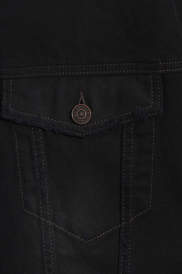 Black loose-fitting denim jacket from Balenciaga. Fastened with buttons, this long sleeve design features two buttoned flap pockets, two slip pockets, logo embroidery with a print at the back and vintage effect.