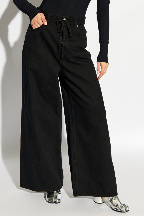 Discover the epitome of avant-garde elegance with the Wide-Leg Jeans from the exclusive MM6 Maison Margiela collection. Crafted with meticulous attention to detail, these jeans are a testament to sophisticated design and contemporary fashion sensibilities. Rendered in a sleek black hue, they exude a timeless allure, seamlessly blending with any wardrobe. Made from premium 100% cotton, these jeans promise not only unmatched style but also comfort and durability. The distinctive wide-leg silhouette is designed to offer a flattering fit, while the high waist cinches in to accentuate your shape. Practical yet stylish, these jeans feature a button and zip closure, adjustable drawstring waist, and classic elements such as belt loops and pockets, ensuring functionality is as integral as fashion. A subtle yet significant touch is the brown leather patch adorned with embossed letters and the logo, placed meticulously on the rear pocket. This detail serves as a hallmark of quality and authenticity, distinguishing the garment as a piece of the revered MM6 Maison Margiela legacy. Why Purchase This Product? Exquisite craftsmanship from a renowned designer brand. Timeless design with a modern twist, suitable for various occasions. High-quality materials ensure comfort and longevity. Adjustable waist and practical features for everyday convenience. Unique identification through the signature leather patch.
