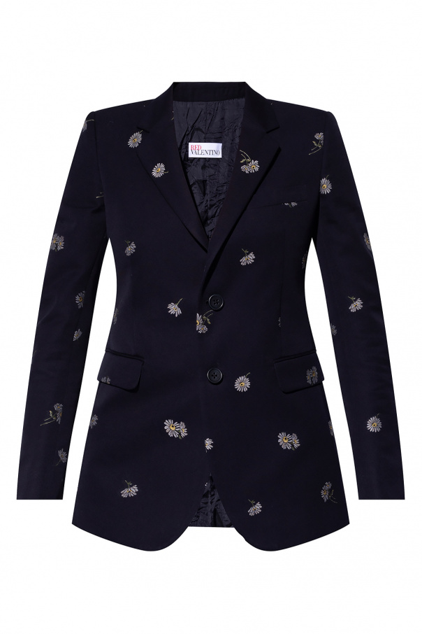 Navy blue blazer from Red Valentino. Illustrated with a floral pattern, this cotton-crafted style fastens via buttons and features notch lapels, two flapped pockets and padded shoulders.