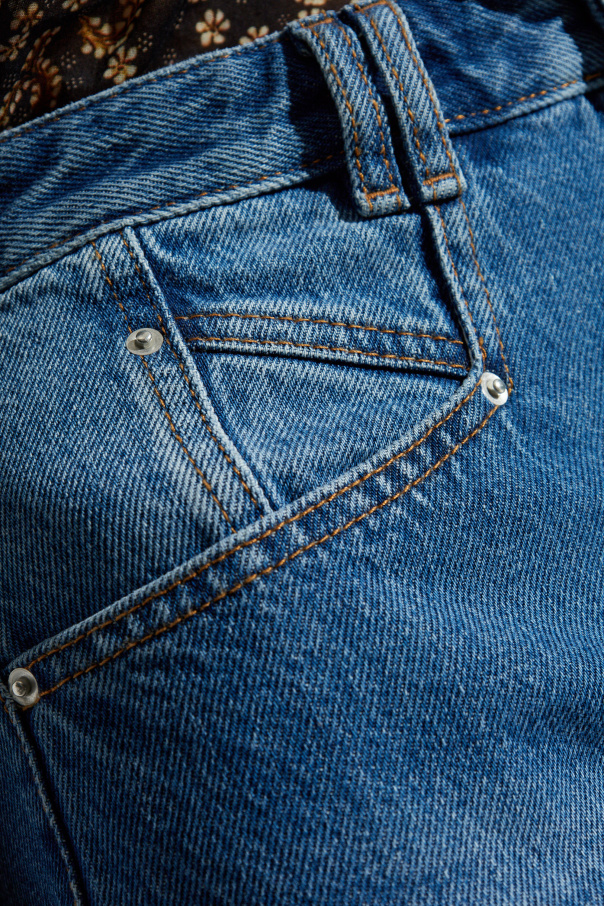 Introducing the "Lemony" Jeans by Isabel Marant, a symphony of classic denim aesthetics and modern design sensibilities. Crafted from 100% cotton, these jeans offer both comfort and durability, making them a staple for any wardrobe. The timeless blue hue is accentuated with distinctive fade patterns and lighter areas, adding visual depth and texture that captures the essence of denim's rugged charm. The "Lemony" jeans feature a high waist that gracefully accentuates the waistline, elongating the legs for a flattering silhouette. The quintessential bell-bottom flare adds a touch of retro elegance, making a statement with every step. Equipped with classic belt loops, front and rear pockets, and a tastefully placed light brown brand tag on the waistband, these jeans blend functionality with high fashion. Attention to detail is paramount, as evidenced by the contrasting orange stitching and silver rivets and buttons that not only enhance the aesthetic appeal but also reinforce the construction of the jeans. The meticulous craftsmanship ensures that the "Lemony" jeans are not only a garment but a piece of wearable art. Why Purchase the "Lemony" Jeans? Exquisite Craftsmanship: Designed by the renowned Isabel Marant, ensuring unparalleled quality and style. Iconic Design: The bell-bottom cut and high waist offer a flattering and timeless look. Quality Materials: Made from 100% cotton, providing both comfort and durability. Distinctive Details: Unique fade effects, contrasting stitching, and branded accents set these jeans apart.