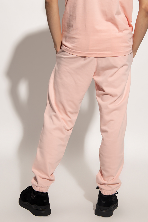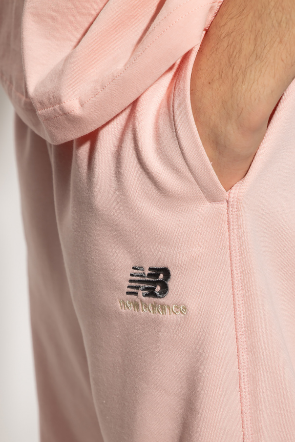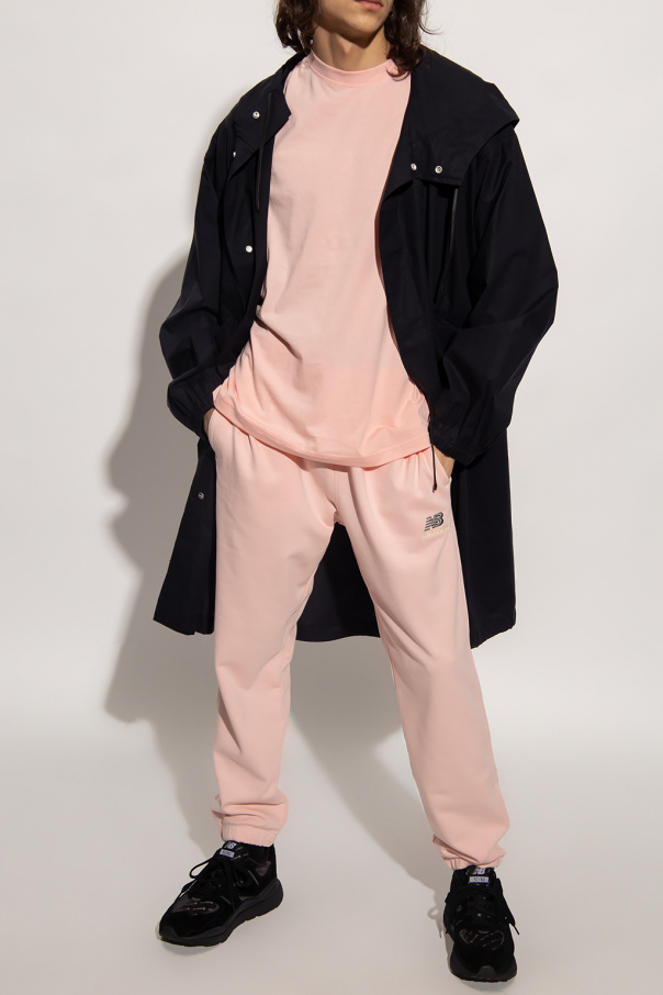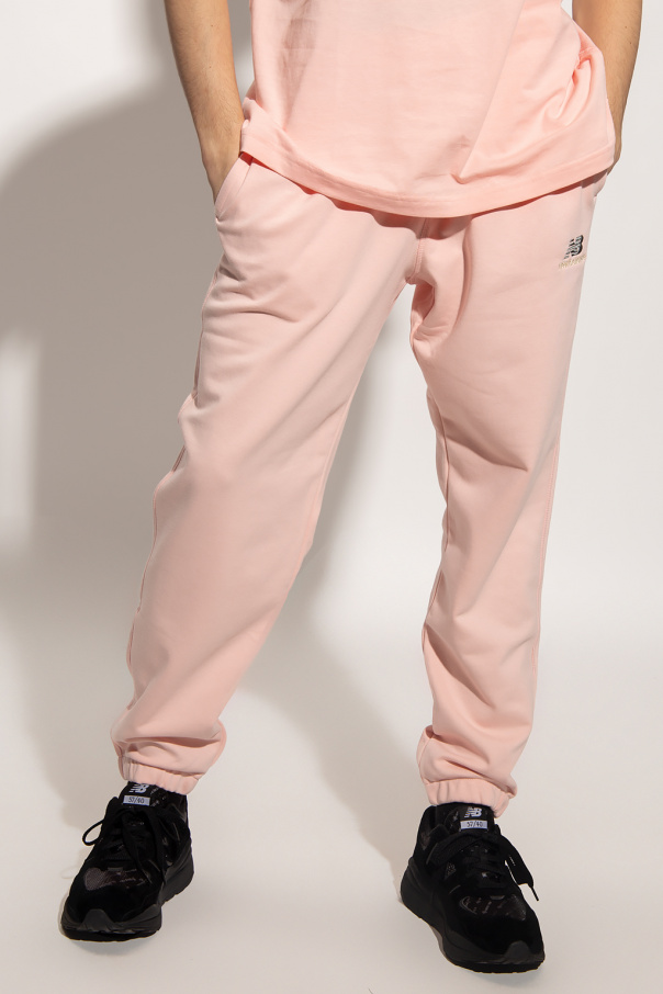Light pink sweatpants from New Balance. Embroidered with the brand's logo in white and grey, this pair features a drawstring waistband, three slip pockets and elasticated cuffs. This model was created as part of the Better Cotton Initiative that promotes the improvement of cotton growing standards and is distinguished by the 'Green Leaf' symbol, which indicates that products were made of at least 50% environmentally friendly materials - recycled or organic.