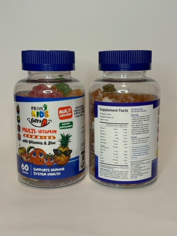 Profikids Extra — це унікальна збалансована формула, яка містить 12 основних мультивітамінів і поживних речовин, які сприяють загальному здоров’ю дітей, подається у смачних, легко сприйманих і засвоюваних цукерках із 4 різними смаками. (Апельсин, полуниця, яблуко, ананас)
