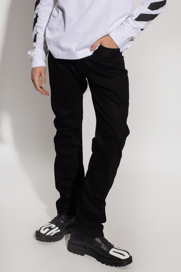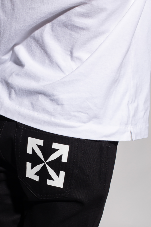 Black jeans from Off-White. Made of cotton, this pair falls with slightly tapered legs and features a zip fly with a button, classic five pockets, a white graphic print with the brand's logo and a black logo patch at the back.