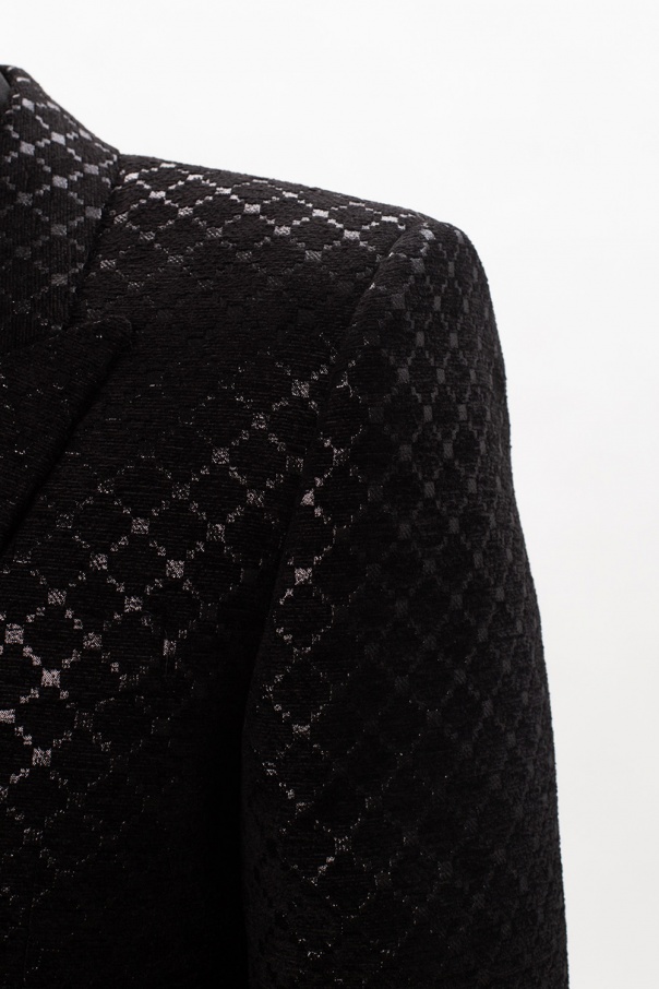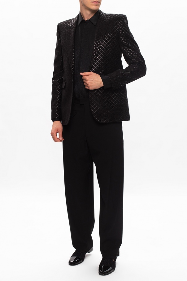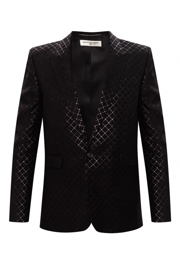 Black blazer from Saint Laurent. Crafted from lurex yarn blend, this style fastens via button and employs notched lapels, two flap pockets on the front and single vent on the back.