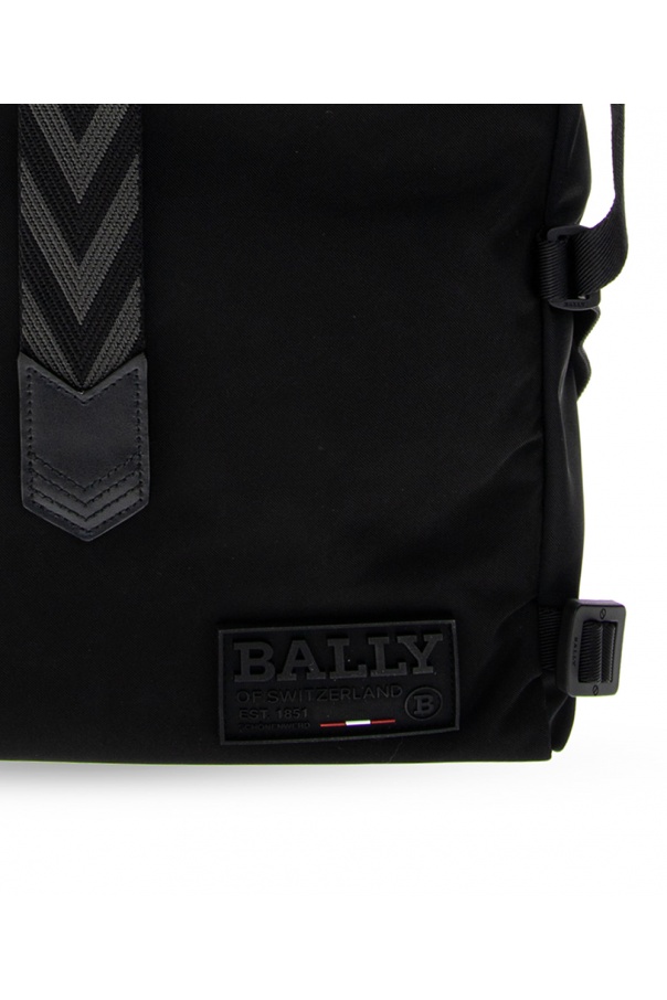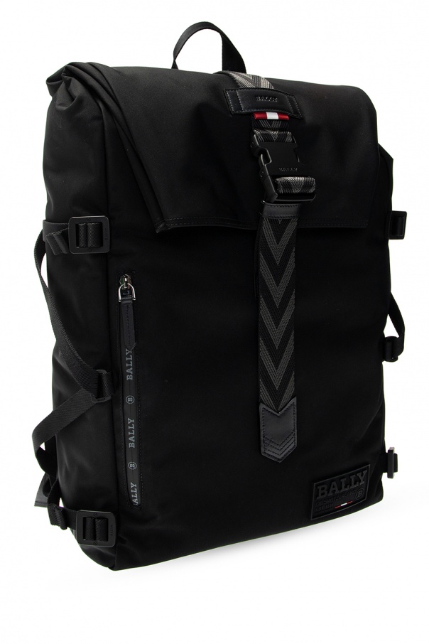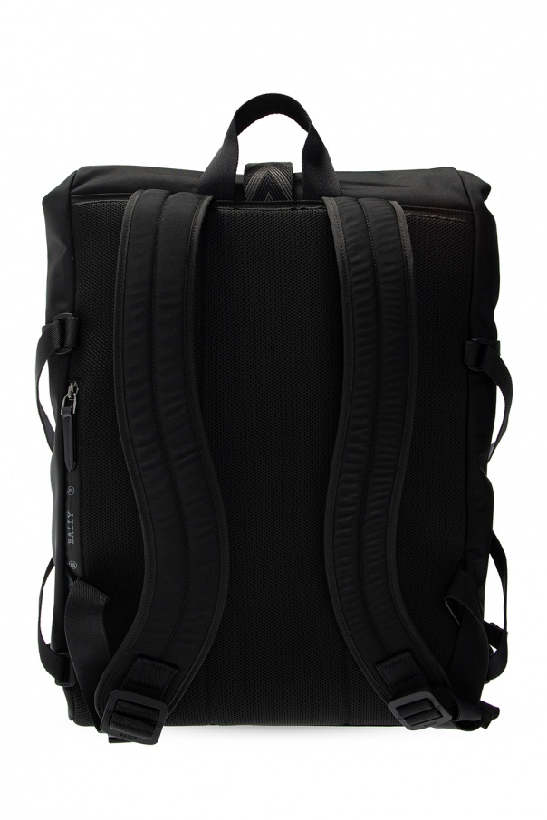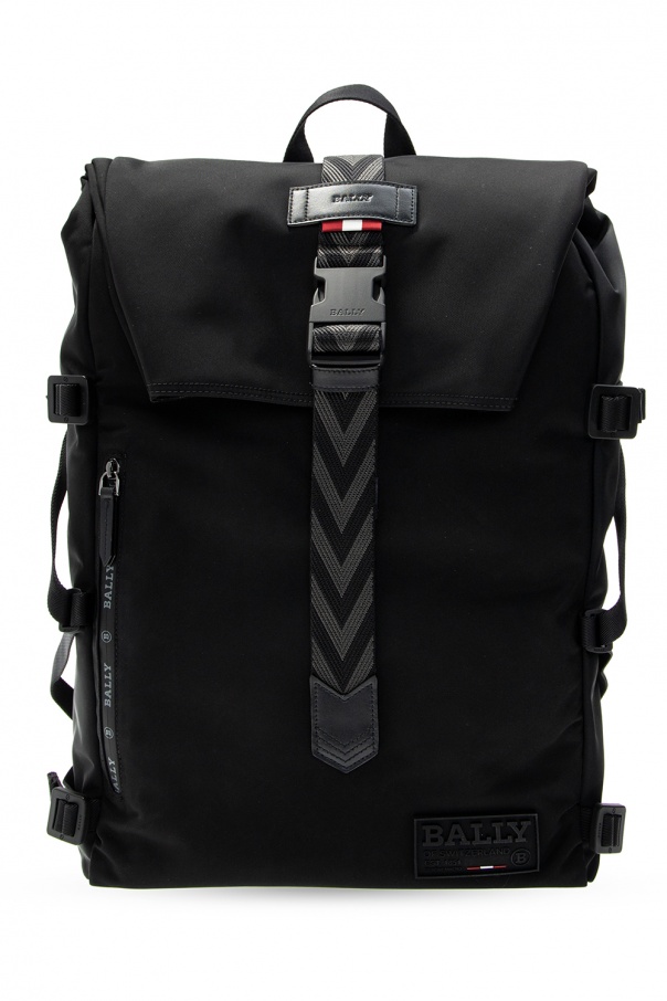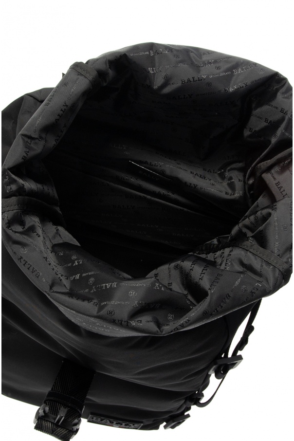 Black backpack from Bally. Designed with several pockets for added utility, this design fastens via snap-button and showcases a half-round handle, adjustable shoulder straps, logo patches and one internal compartment with a slip pocket.