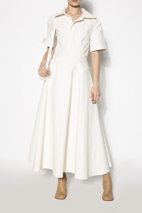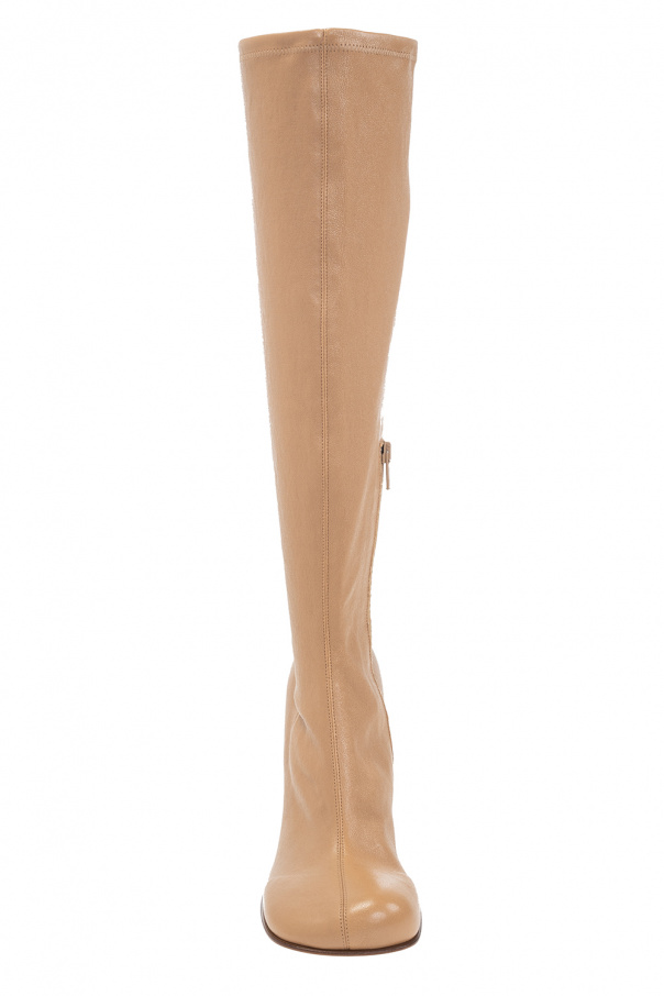 Beige ‘Bloc’ heeled knee-high boots from Bottega Veneta. Crafted from lamb leather, this model sits on a beige leather sole and features a side zip closure.