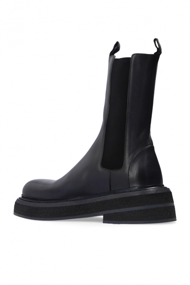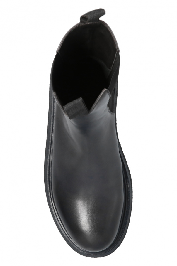 Dark grey ankle boots from Marsll. Crafted from calf leather, they sit on a dark grey rubber platform and feature elastic panels on the sides.