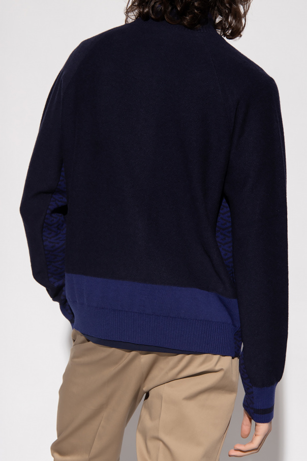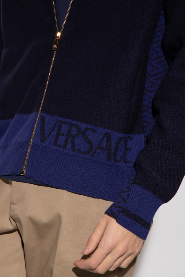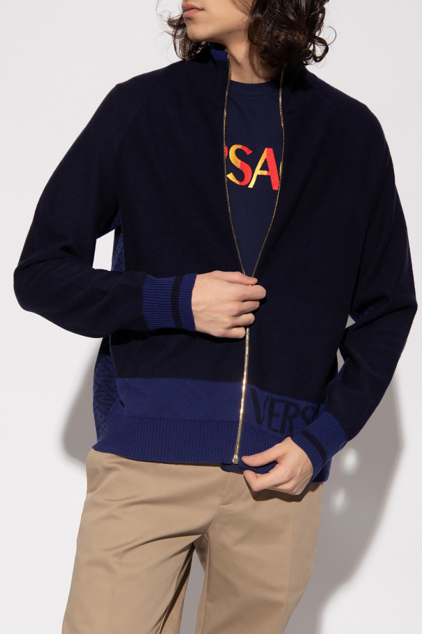 Dark blue and navy sweater from Versace. Made of wool and cashmere, this garment features a zip fastening, the label’s signature Greek pattern, logo embroidery, two slip pockets and ribbed trims at the neck, hem and cuffs.