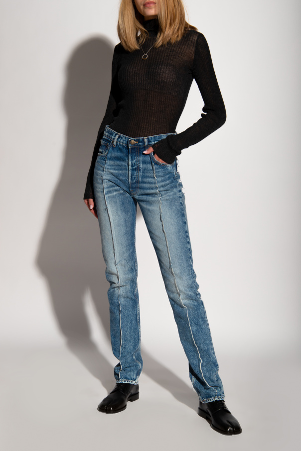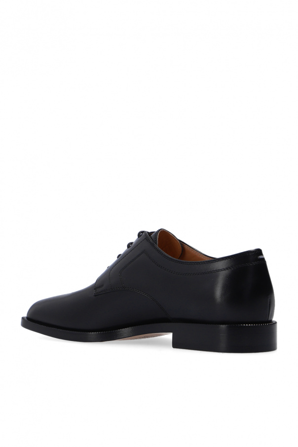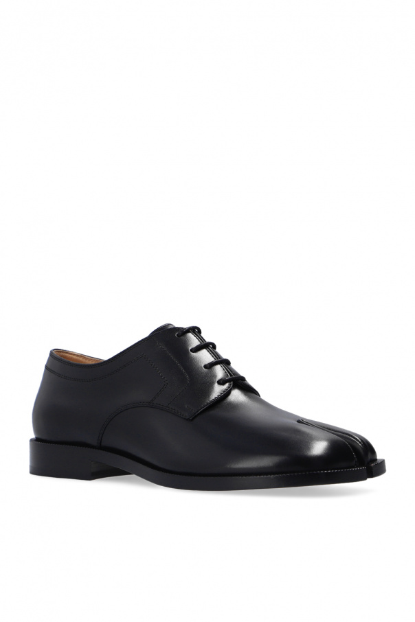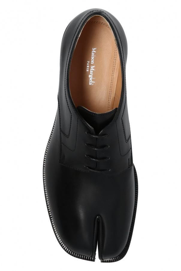 Black shoes from Maison Margiela. Made of leather, this lace-up pair sits on a beige leather sole and showcases the brand's iconic ‘Tabi’ split-toed design.