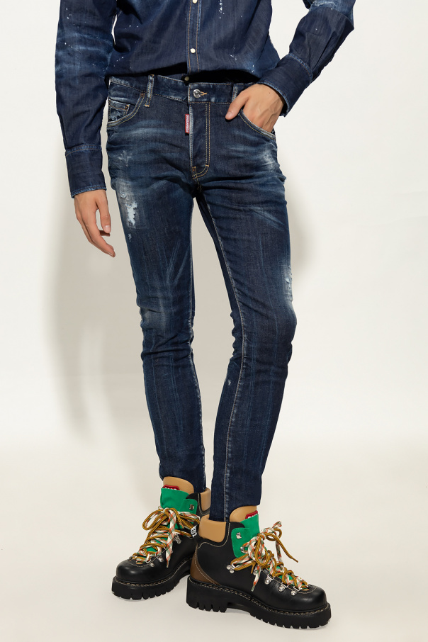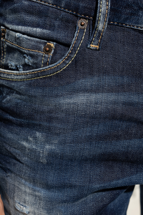 Navy blue ‘Super Twinky’ jeans Dsquared2. Made from cotton, this pair falls with tapered legs and features button fastenings, classic five pockets, distressed details, a back logo patch and raw hems.