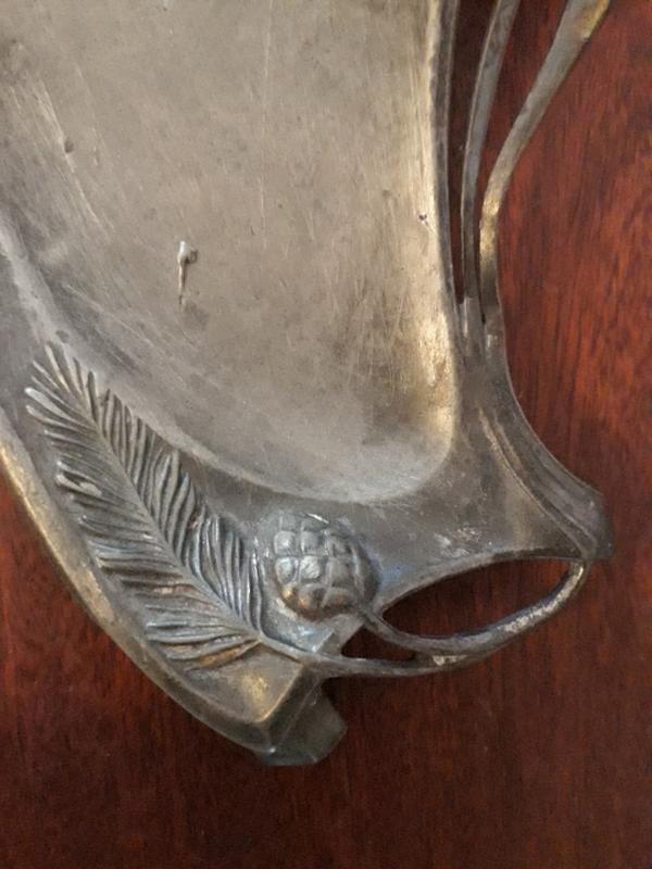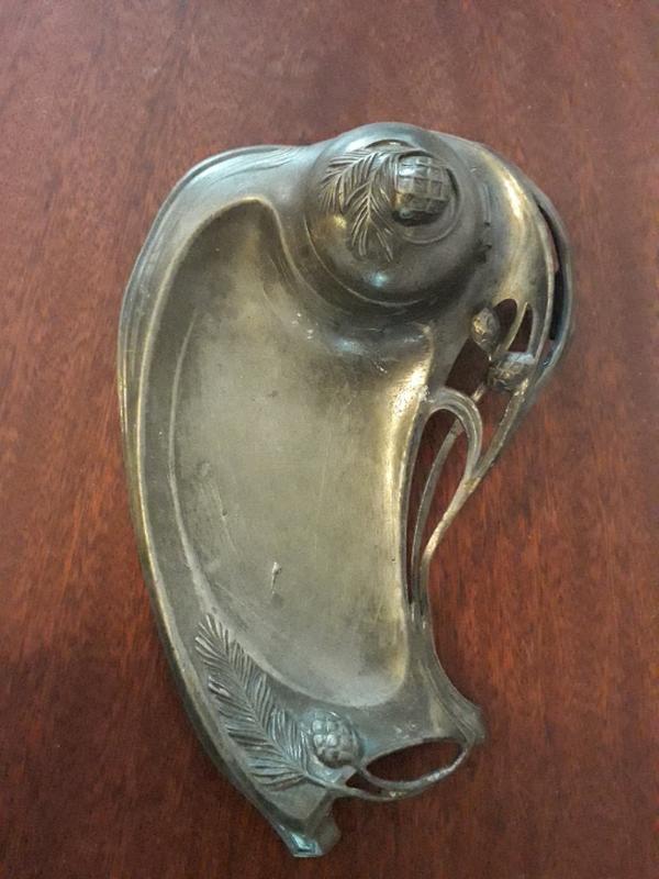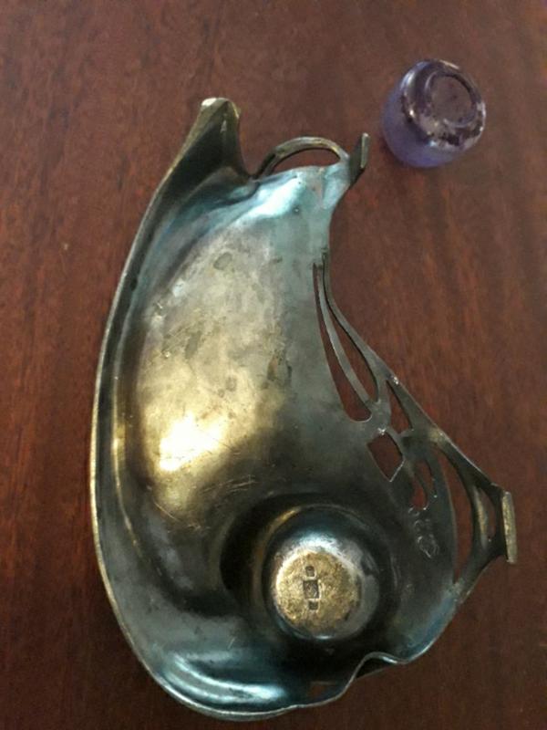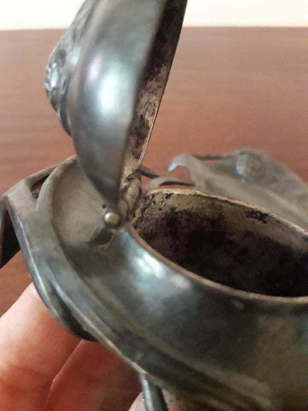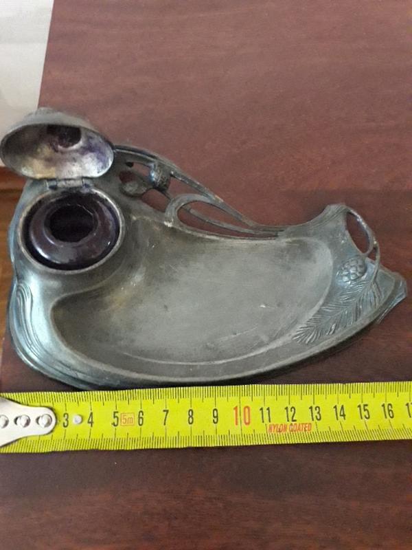 Для настоящих ценителей раритетная антиквариатная чернильница немецкого бренда WMF.Три клейма.19 век.На первом клейме большая буква В,на втором в заштрихованном квадрате ромб с бегущим страусом и внизу буква G,на третьем две буквы OX..Внутри стекляный пузырек,,еще в чернилах.По клейму с бегущим страусом можно вычисть в ин-те годы выпуска.Настоящее сокровище для коллекционера!