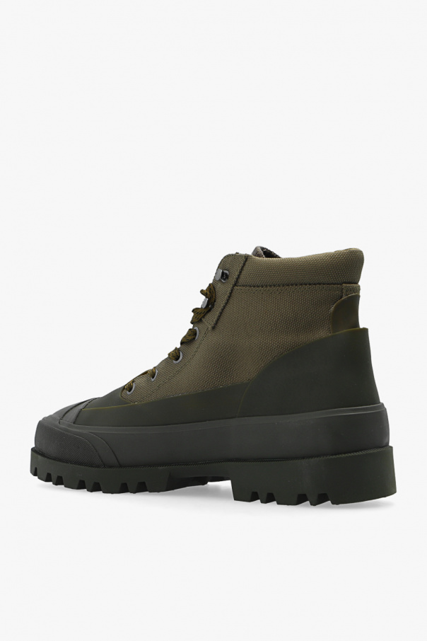 Dark green ‘D-HIKO BT X’ ankle boots from Diesel. Crafted in ballistic nylon and trimmed with rubber, this lace-up model takes cues from military boots and features a logo-printed tongue, white lettering on the side and a chunky dark green sole in vulcanised rubber.