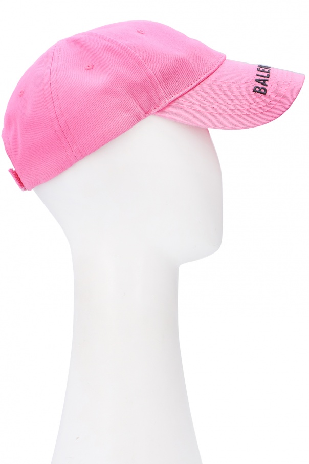 Pink baseball cap from Balenciaga. Embroidered with Balenciaga logo in black, this cotton-crafted piece of headwear is complete with a velcro strap on the back.