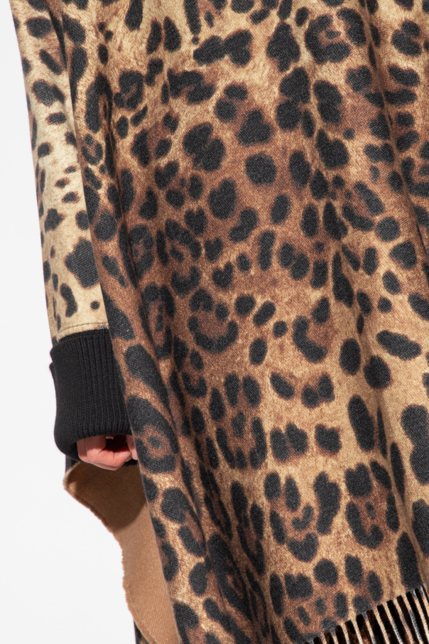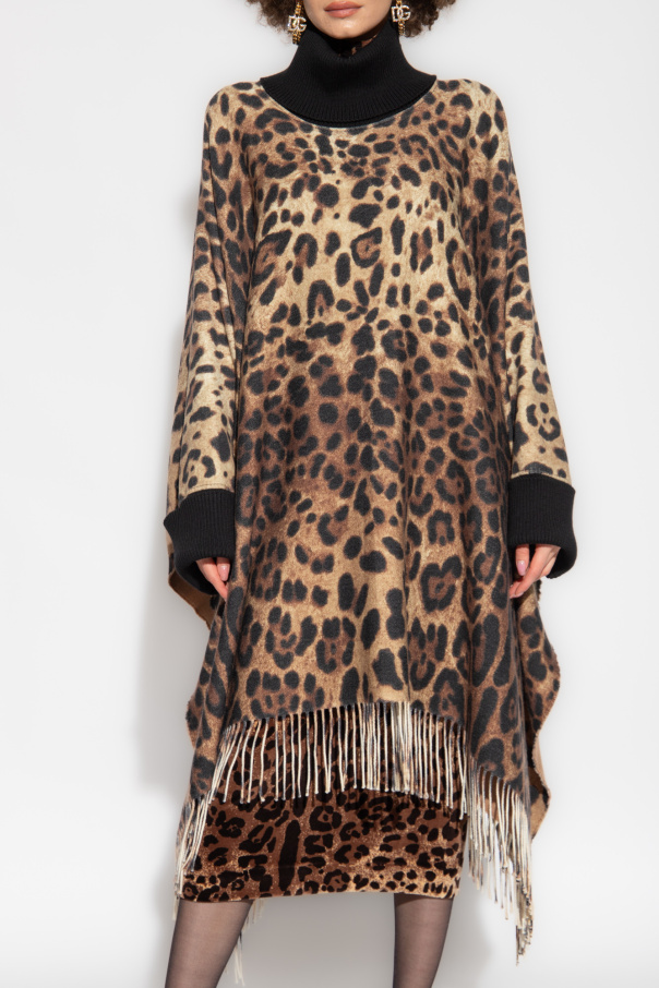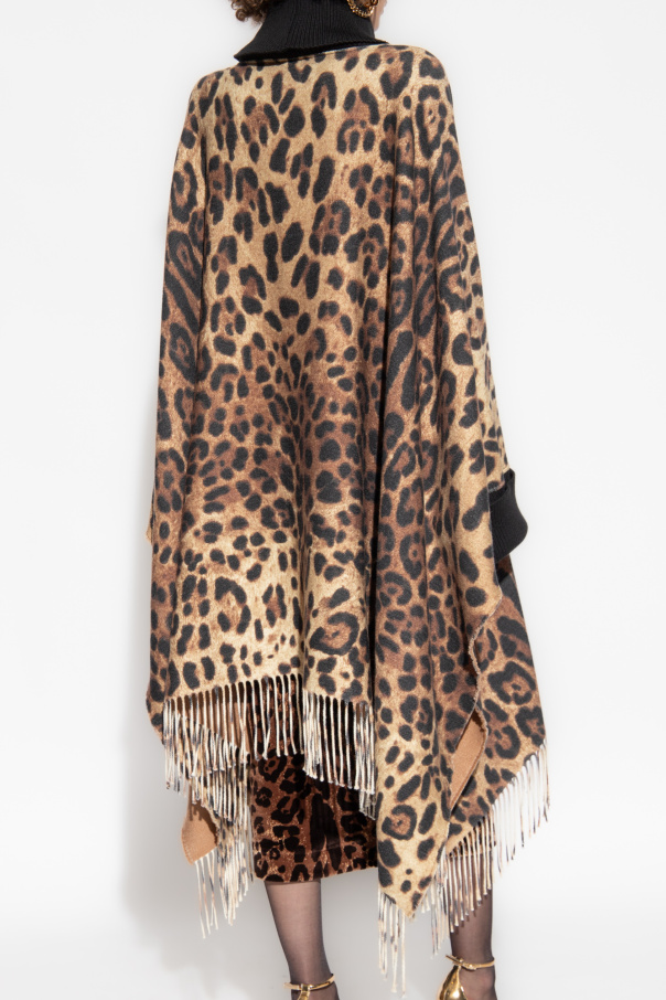 Beige, black and brown poncho from Dolce & Gabbana. Made from wool, this style showcases an animal motif. It is complete with ribbing on the standing collar and sleeves and fringe detailing on the hem.
