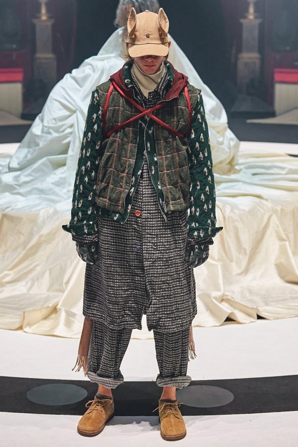 Black and white coat from Undercover. Crafted from wool, this garment features button fastening, an embroidered check pattern, two slip pockets and a strap with colorful buttons on the sleeves.