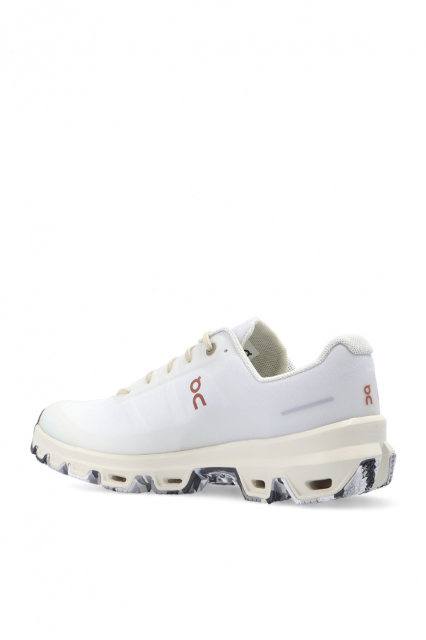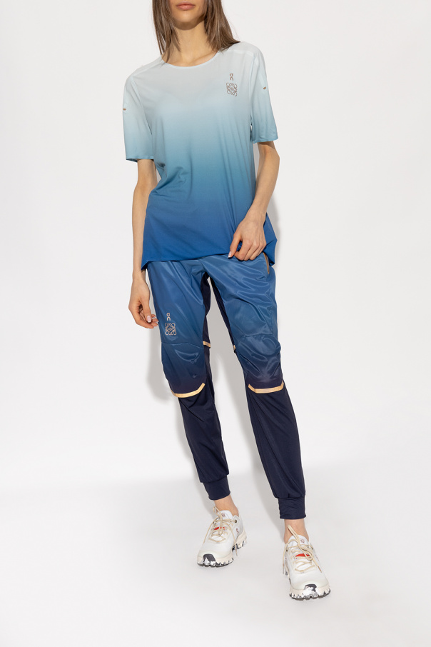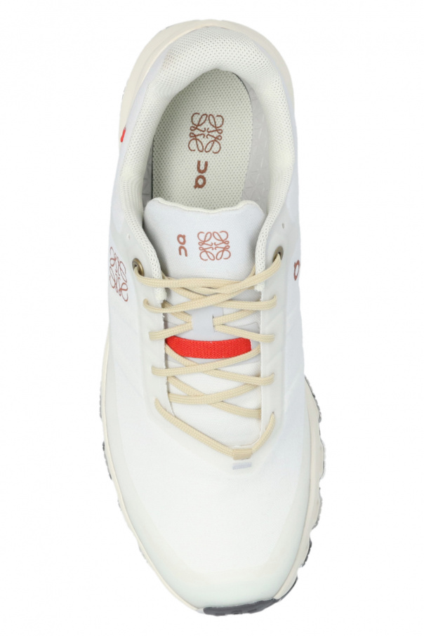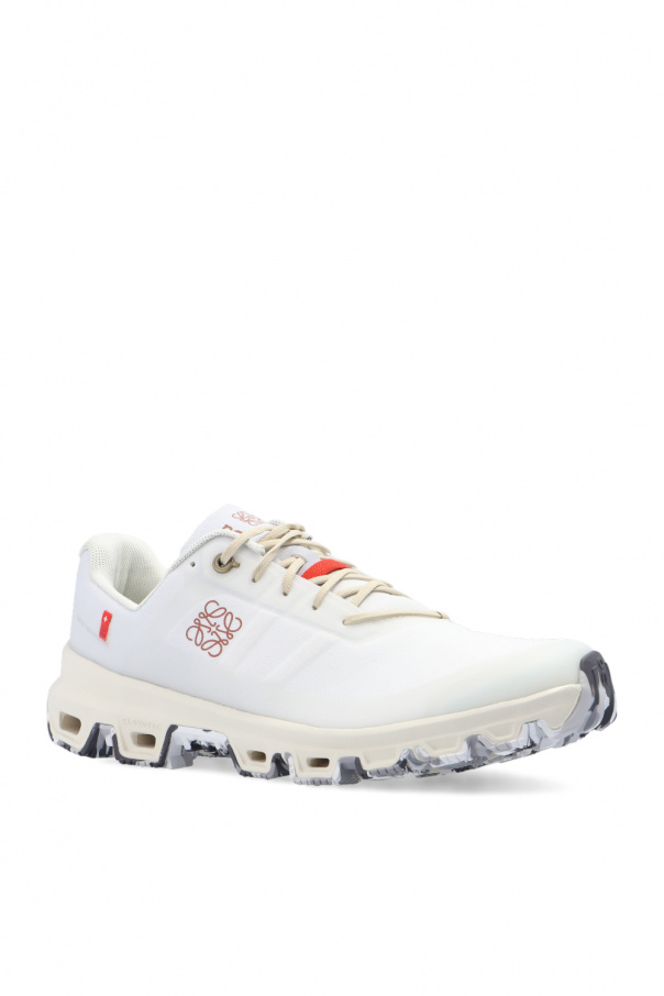 Grey ‘Cloudventure’ running shoes from Loewe x ON. Crafted from waterproof material, this lace-up model sits on a multicoloured rubber sole and showcases a brown graphic pattern and gradient effect. A limited-edition capsule collection of shoes and apparel designed for modern adventure. Crafted for city life the great outdoors, it represents a reimagined approach to craft skills.