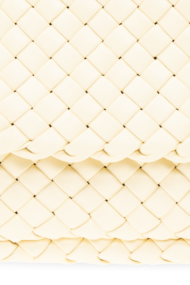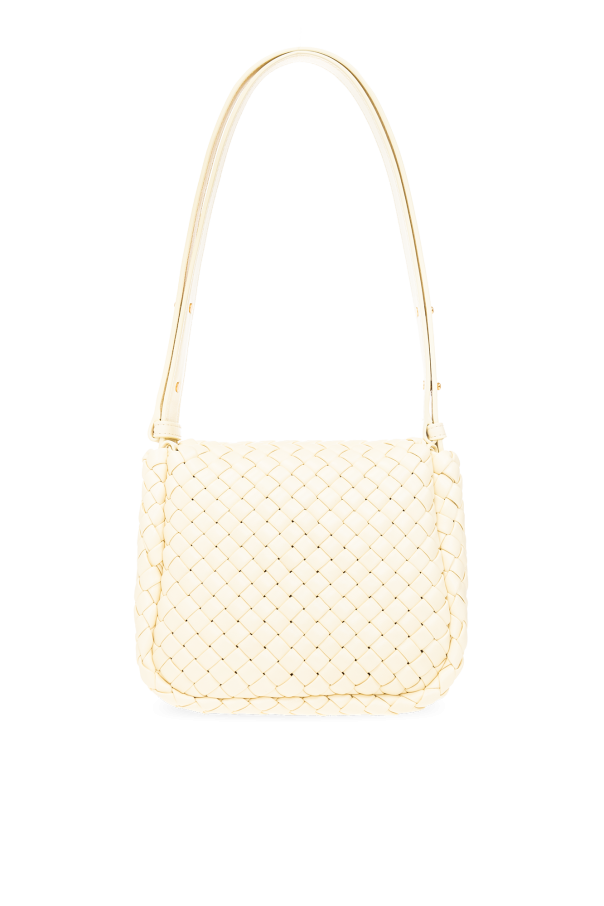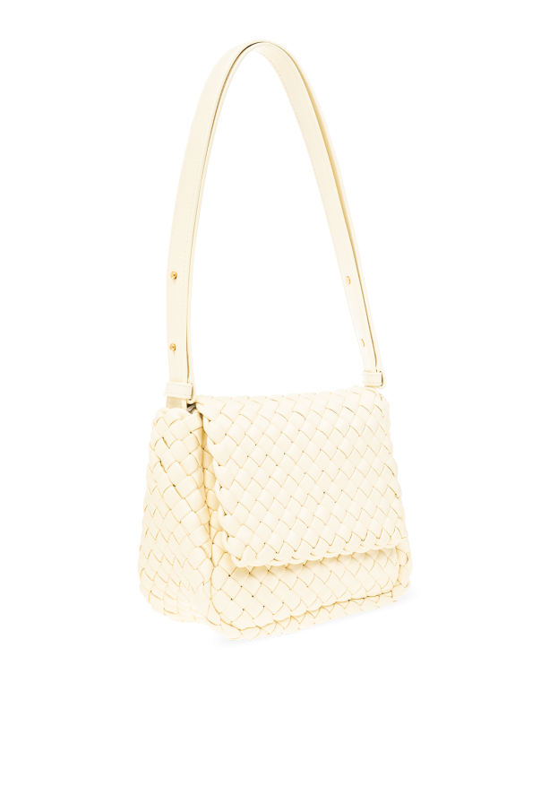 Light yellow ‘Cobble Small’ shoulder bag from Bottega Veneta. Made from lamb leather with the brand's signature Intreccio weave, this design features an adjustable shoulder strap, gold-tone metal hardware and one internal compartment.